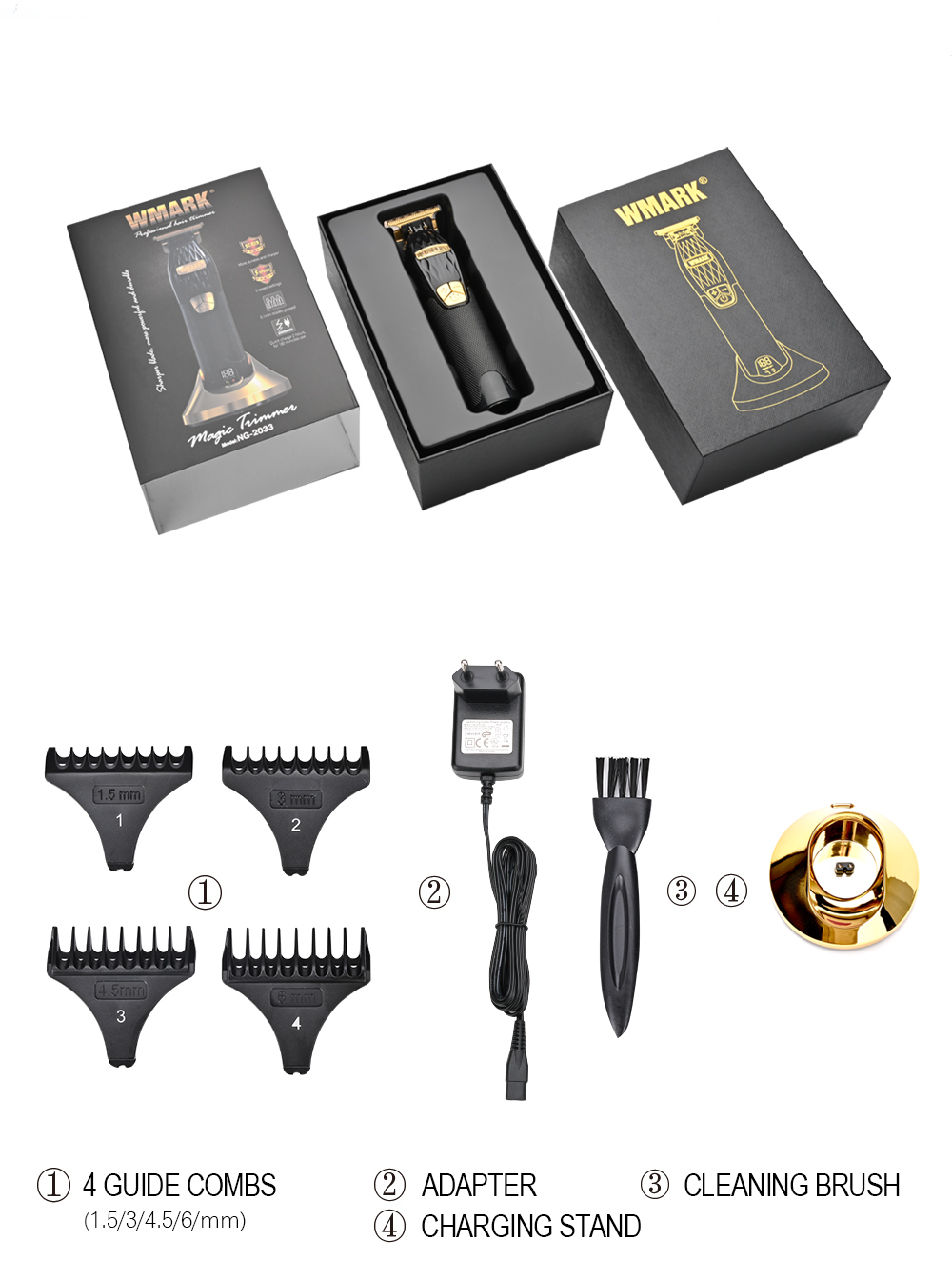 • Accessories: 4 guide combs(1.5/3/4.5/6mm), lubricating oil, cleaning brush, adapter and charging stand.